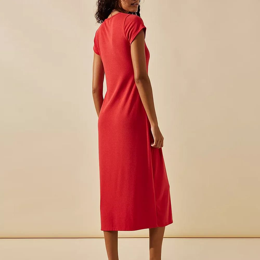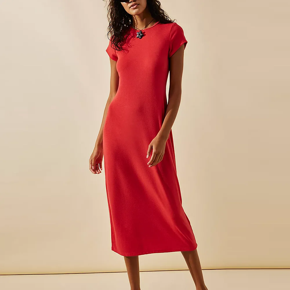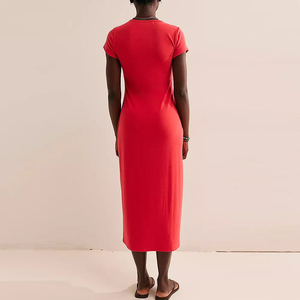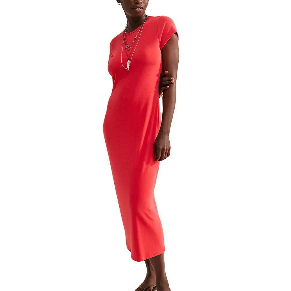 Women's Solid Color Plain Short Sleeve Dress Casual O Neck Women Slim Fit Long Midi Length Pencil Dress